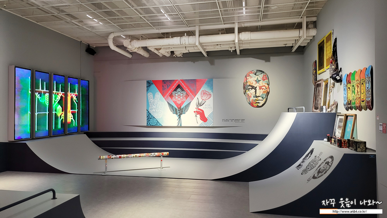 어린 시절 셰퍼드 페어리에게 영감을 주었던 스케이트보드 문화와 펑크 록을 모티브로 구성된 이 공간에는 대규모 스케이트보드 작품과 실제로 스튜디오에서 옮겨온 소품이 전시되어 있습니다.