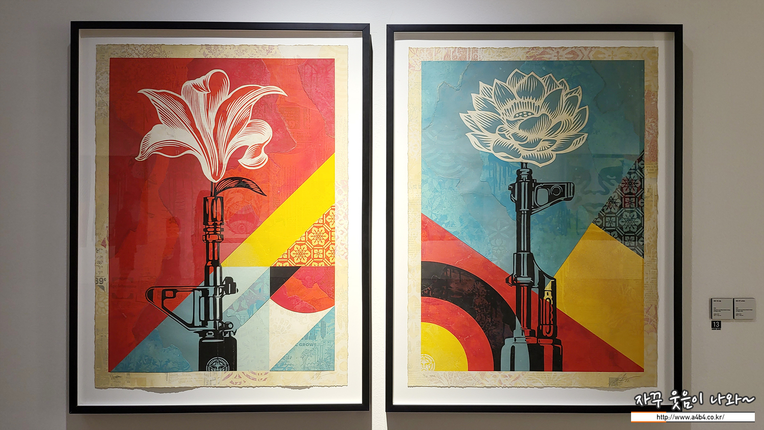총신의 끝에는 총알이 아닌 연꽃과 백합이 피어 있습니다. 세퍼드 페어리는 베트남 전쟁을 반대하는 시위자들이 평화를 위해 그리고 시위를 진압하기 위해 끌려온 국가 방위군의 총에 꽃을 꽂은 것을 보고 영감을 받아 이 작업을 시작했습니다.