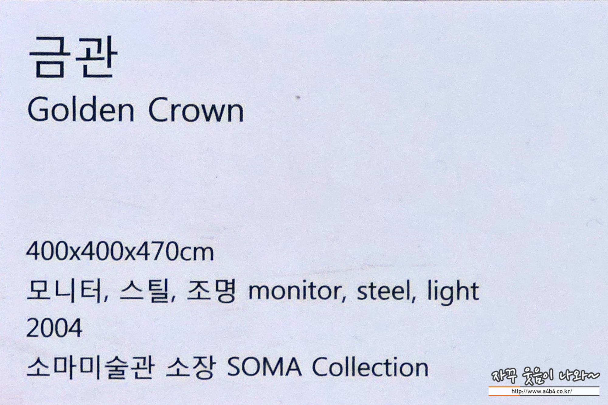 백제시대의 금관을 모티브로 작업한 작품으로 보입니다. (송파구가 한성백제의 지역에 있어...) 소마미술관 백남준 비디오아트홀에 아쉬운 부분은 그의 작품에 대한 해설이 전무하네요. 작품의 의미에 대한 설명이 있었으면 더욱 좋았을 것 같더라는... 제가 검색을 못해서 그런지 몰라도 소마미술관 소장품 내역 등에서도 이곳에 전시된 작품에 대한 내용이 없습니다.