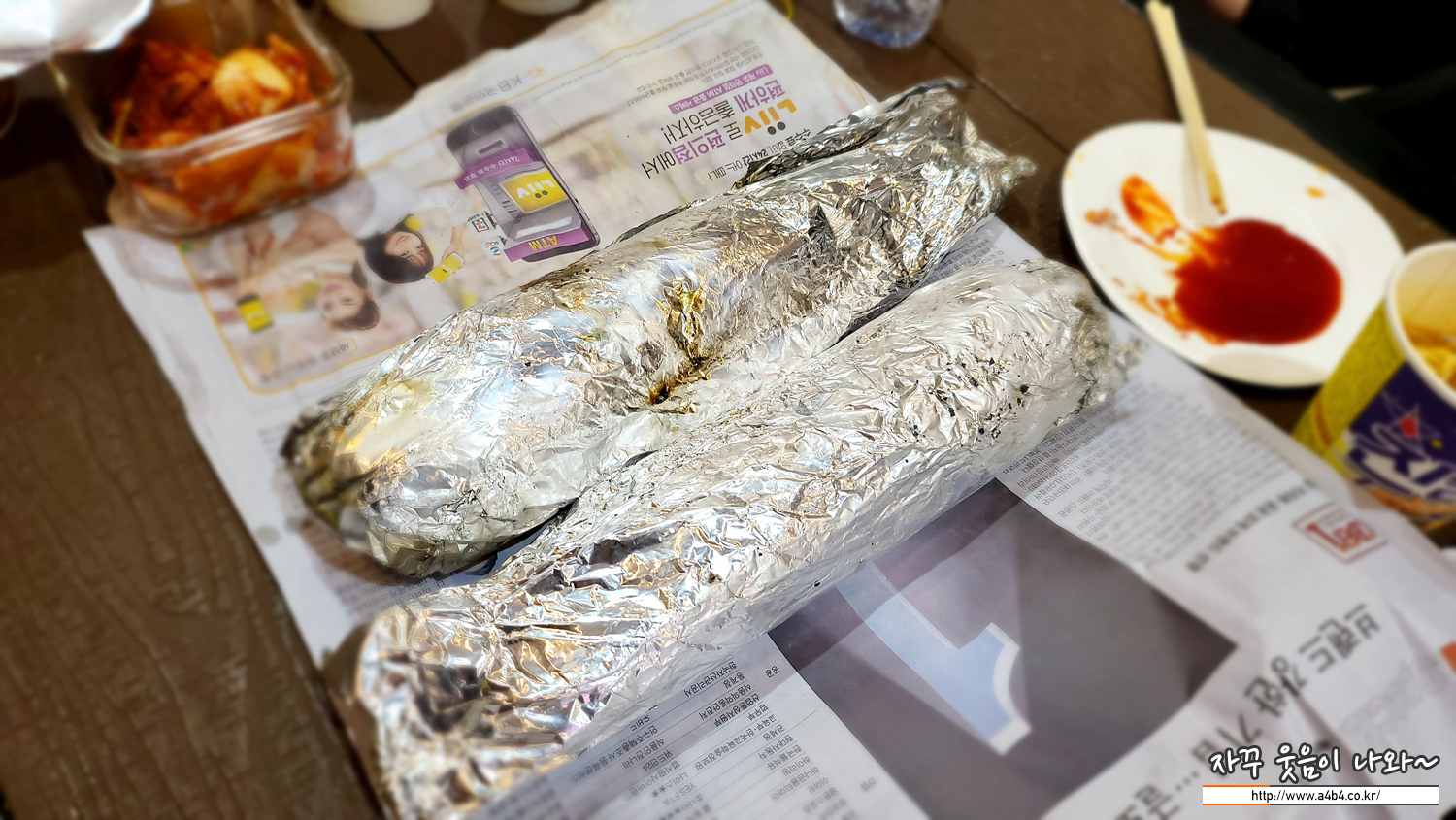 번호표를 드리니 뜨거운 송어를 쉽게 가지고 갈 수 있도록 신문지에 감싸서 주십니다. 심문지 양쪽 끝을 들고 식당으로...
