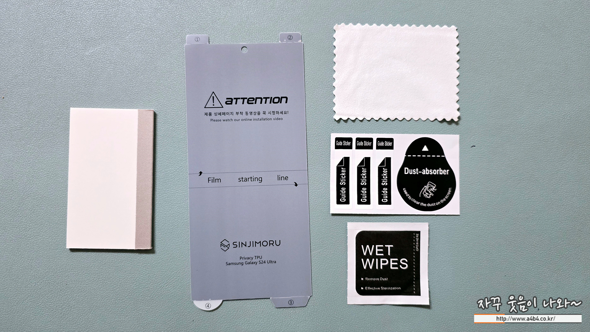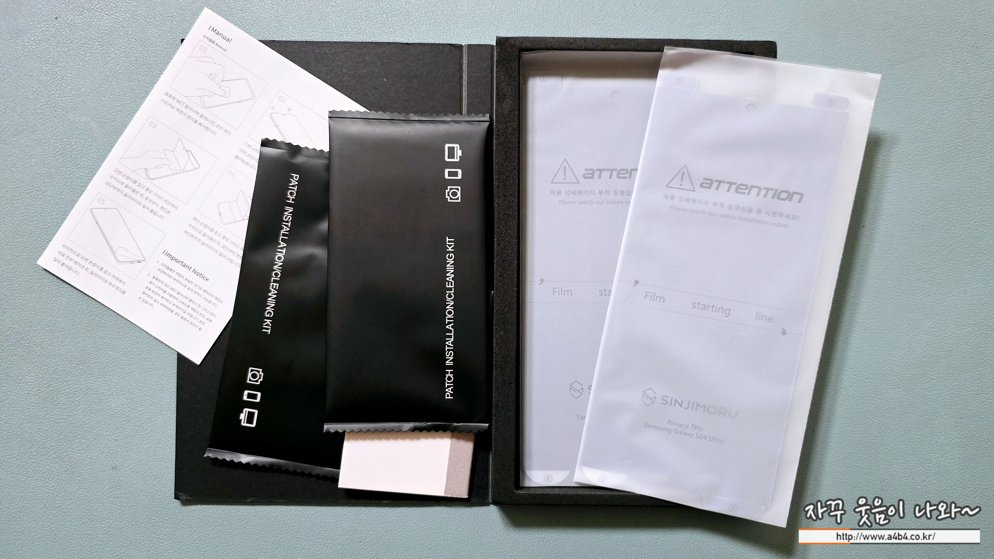 두 장의 갤럭시 S24 울트라용 액정보호 필름과 클리닝킷 세트. 그리고 스퀴즈 하나가 들어 있습니다.