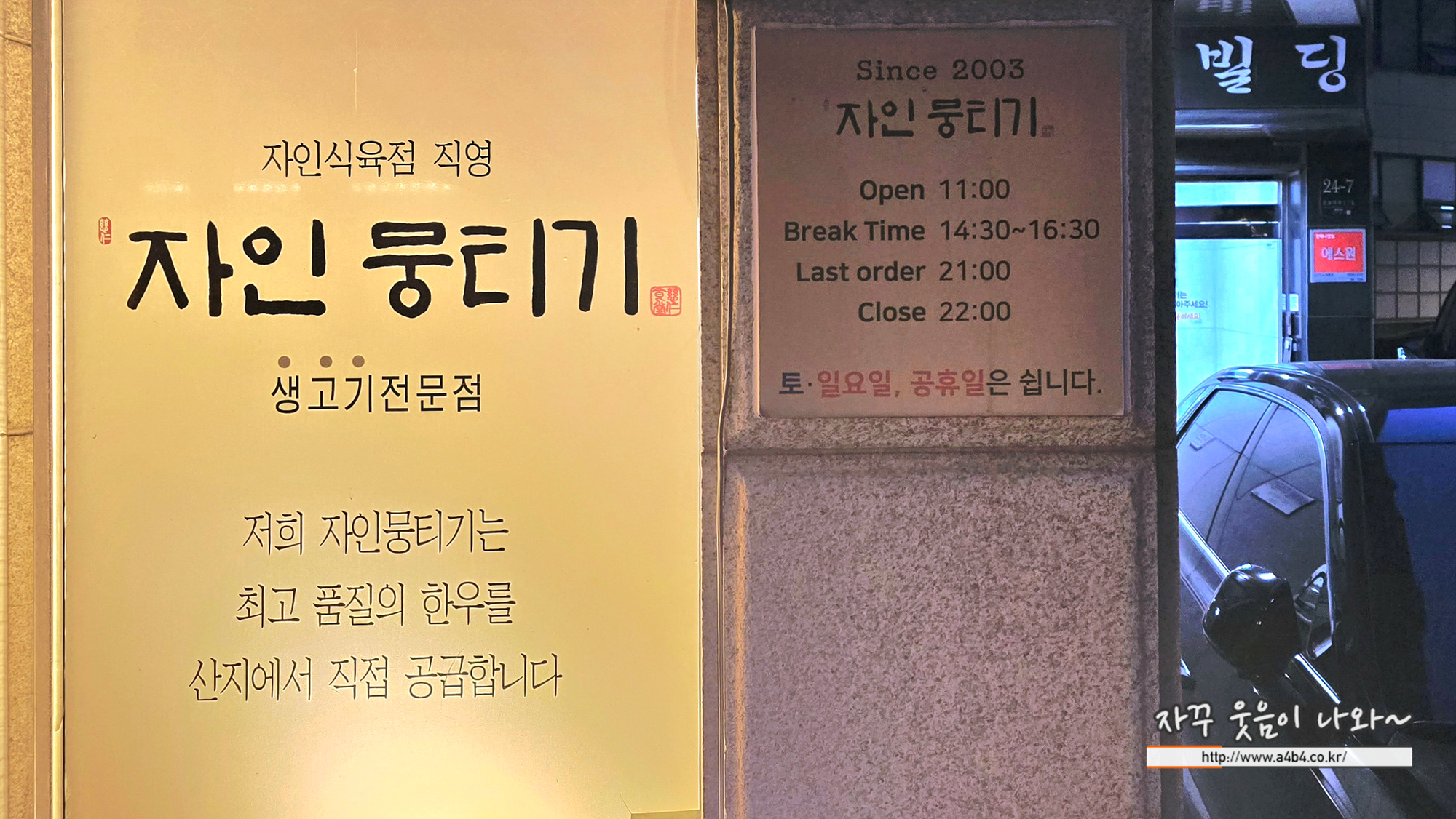 양재역 고기 맛집 자인뭉티기는 주중에만 영업합니다. 주말인 토요일과 일요일에는 영업하지 않네요. 영업시간은 11시 ~ 22시로 라스트오더는 마감 한 시간 전인 21시 입니다. 자인뭉터기 브레이크타임은 14:30 ~ 16:30분 입니다.