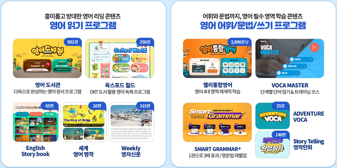 이미 아이가 어느정도 영어에 익숙하다면, 그 이상의 영어 서비스를 만나 보세요. 초등학교 저학년은 물론 고학년 수준의 다양한 영어 서비스도 제공되고 있습니다.