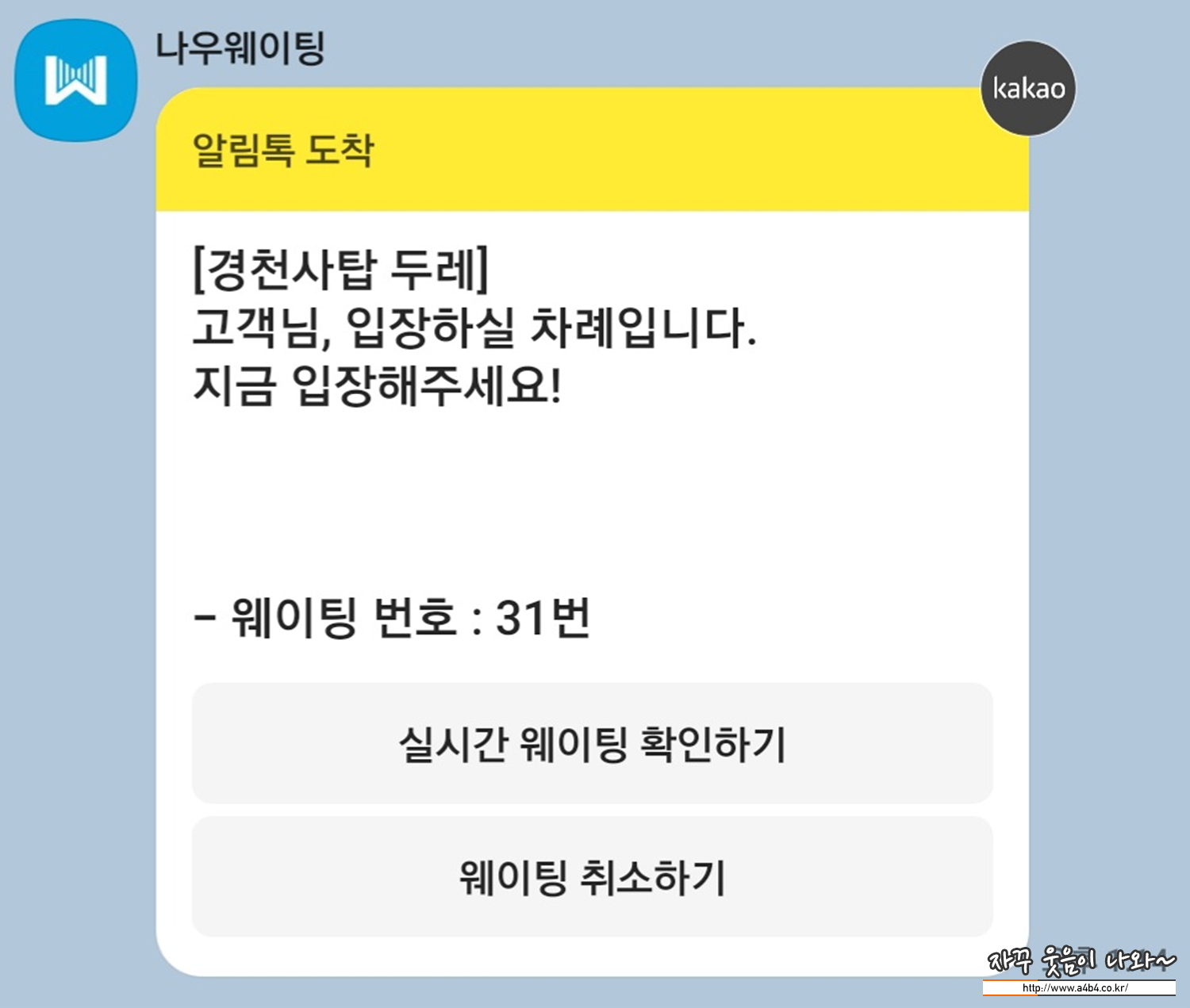 딩동~ 저희 입장시간이 되었습니다. 스마트폰으로 입장알림이 오네요.