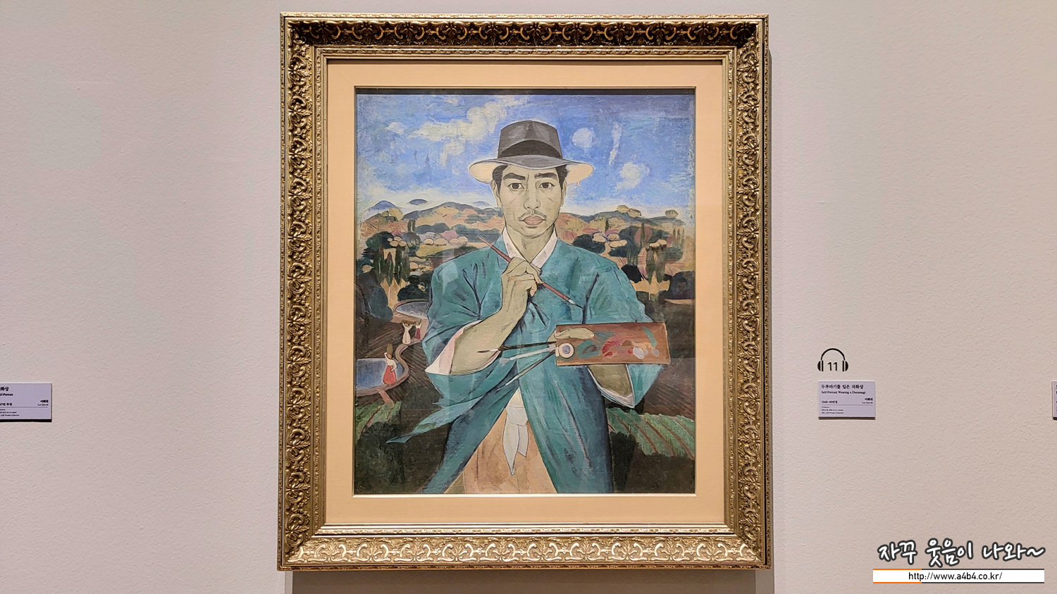 평화로운 시골 마을을 배경으로 당당히 한 사내가 당당히 서 있습니다. 파란 원색 두루마기에 서양식 중절모를 쓰고 있고, 왼손엔 서양의 팔레트를, 오른손엔 동양의 붓을 들고 있습니다. 이쾌대가 자신의 모습을 그린 자화상입니다. 그 뒤로 논과 밭이 펼쳐진 마을 길엔 물동이를 머리에 인 아낙네들이 걸어갑니다.전형적인 한국 시골의 풍경입니다. 작가는 의도적으로 배경과 소품에서 한국적인 것과 서양적인 것을 함께 담았습니다. 이런 방식으로 이쾌대는 '한국인'이자 '서양화가'라는 자신의 정체성을 드러냈습니다. 입을 포 다물고 진지한 눈빛으로 관객을 바라보고 있는 모습에선 "사회가 발전하기 위해서는 예술가의 역할이 중요하다"고 역설한 이쾌대의 소명 의식이 문어나는 듯합니다.