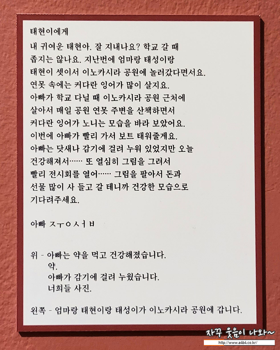 이중섭과 가족간의 편지는 예전 제주도 여행에서 방문한 서귀포 이중섭 미술관에서 접했었는데요. 이곳에서 또 다른 편지를 보게 되었네요. 사랑과 애정이 가득한 이런 편지를 보내고 받을때의 행복한 마음이 느껴집니다.