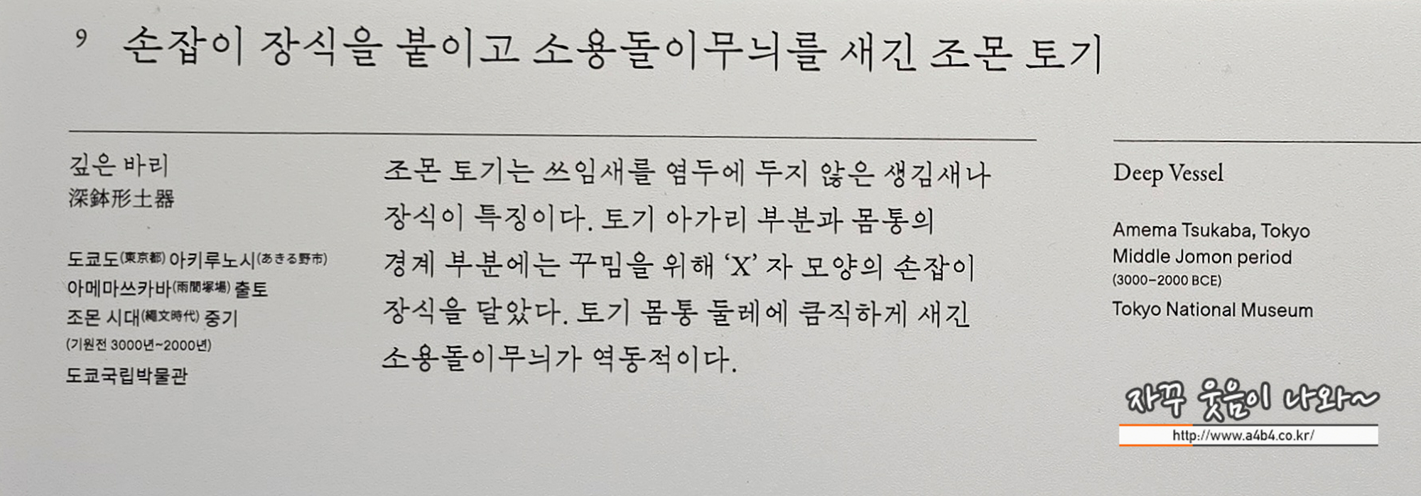 조몬 시대(繩文時代) 후기(繩文後期 기원전 2000년~1000년)와 만기(繩文晩期 기원전 1000년~400년)의 토기는 정교하게 무늬를 새겨 마감한 것과 조리용으로 비교적 간소하게 제작한 것으로 구분할 수 있다. 또한 깊은 바리 외에도 항아리 모양 토기[甕形土器], 뚜껑토기[蓋土器], 귀때토기[耳土器] 등이 등장한다. 토기의 종류에 따라 정확한 용도를 단정할 수는 없지만 당시 사람들이 쓰임새에 따라 다양하게 활용했음을 알 수 있습니다.