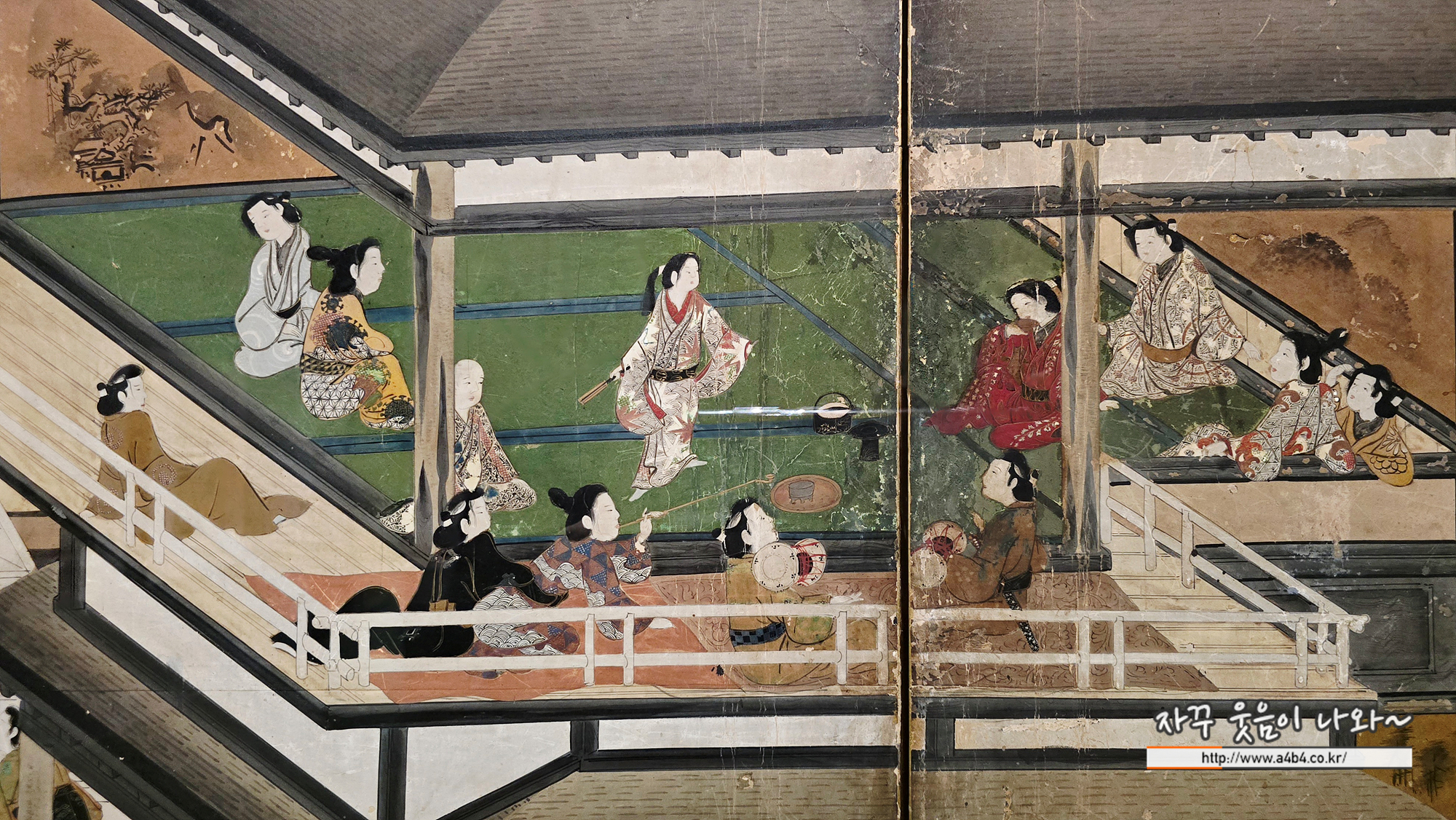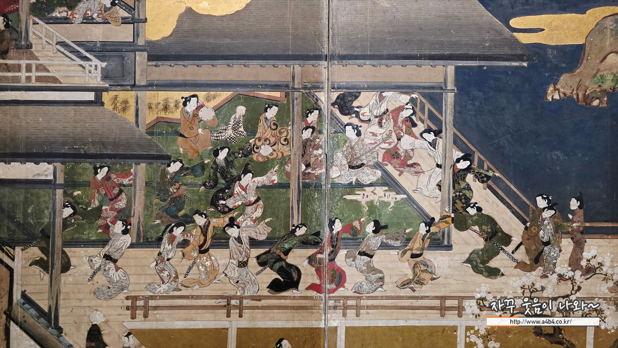 이처럼 다양한 유흥거리를 묘사한 ‘유락도(遊樂圖)’는 무사들의 패권 다툼이 끊이지 않았던 센고쿠 시대(戰國時代)가 끝나고 에도 막부가 들어서면서 사회가 안정된 16세기 말부터 17세기에 많이 제작되었습니다. 오랜만에 찾아온 평화를 즐기려던 당시 사람들의 마음이 잘 반영된 작품입니다.