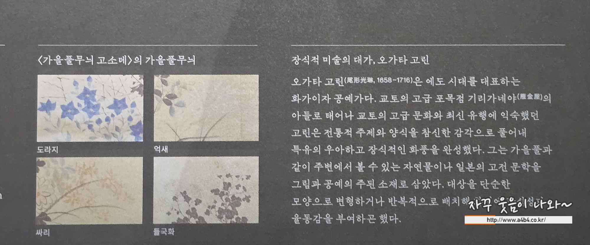 이번 일본미술, 네 가지 시선 전시회는 총 4개의 섹션에서 가을풀무늬 고소데 등 62점의 회화, 도자, 공예, 의상 등 다양한 일본 미술을 만나볼 수 있습니다.