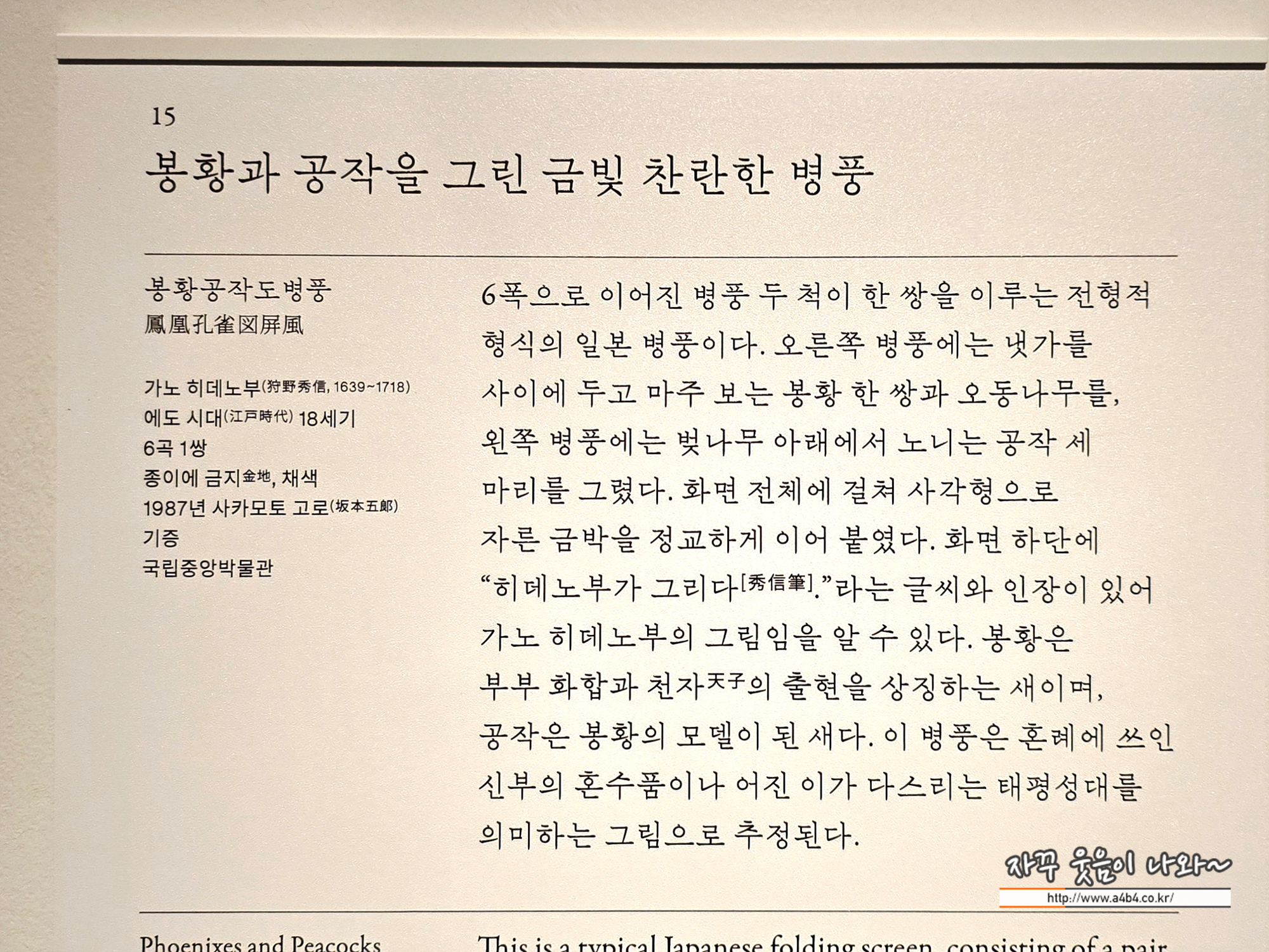 6폭으로 이어진 병풍 두 척이 한 쌍을 이루는 전형적인 일본 병풍이다. 오른쪽 병풍에는 냇가를 사이에 두고 서로 마주 보는 봉황 한 쌍과 오동나무를, 왼쪽 병풍에는 벚나무 아래에서 노니는 세 마리 공작을 묘사했다. 화면의 여백에는 일정한 크기로 잘라낸 사각형 금박을 붙여 정교하게 장식했다. 오른쪽 병풍의 화면 오른쪽과 왼쪽 병풍의 화면 왼쪽 하단에 ‘히데노부 필(秀信筆)’이라는 묵서와 ‘가이의(外記의)’ 인장이 있어, 도쿠가와(德川) 막부의 회화 제작을 전담하던 가노파(狩野派)의 화가가 주세기 히데노부(狩野常信, 1639~1718)의 작품임을 알 수 있습니다.