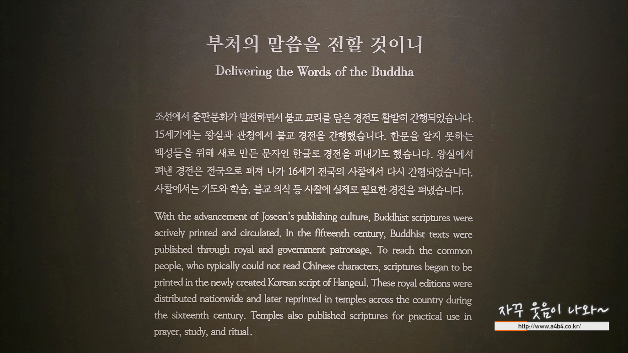 조선에서 출판문화가 발전하면서 불교 교리를 담은 경전도 활발히 간행되었습니다. 15세기에는 왕실과 관청에서 불교 경전을 간행했습니다. 한문을 알지 못하는 백성들을 위해 새로 만든 문자인 한글로 경전을 펴내기도 했습니다. 왕실에서 펴낸 경전은 전국으로 퍼져 나가 16세기 전국의 사찰에서 다시 간행되었습니다. 사찰에서는 기도와 학습, 불교 의식 등 사찰에 실제로 필요한 경전을 펴냈습니다.