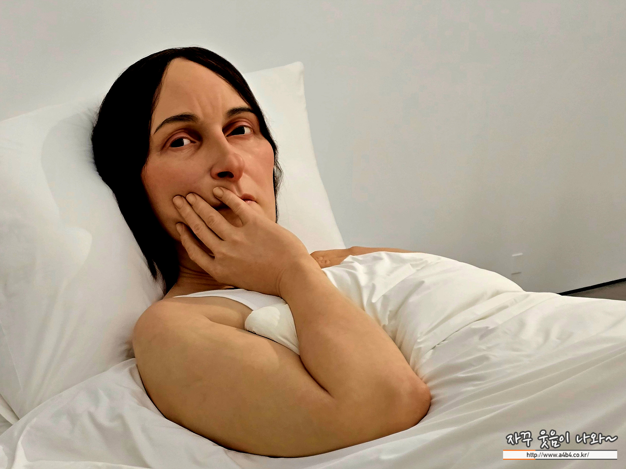 이렇게 이번 국립현대미술관 론뮤익 개인전은 실물크기 또는 과도하게 확대된 하이퍼리얼리즘 조각 작품들을 만나볼 수 있는데요. 지금부터는 다소 우울하고 어두운 느낌의 작품들을 만나보게 됩니다.