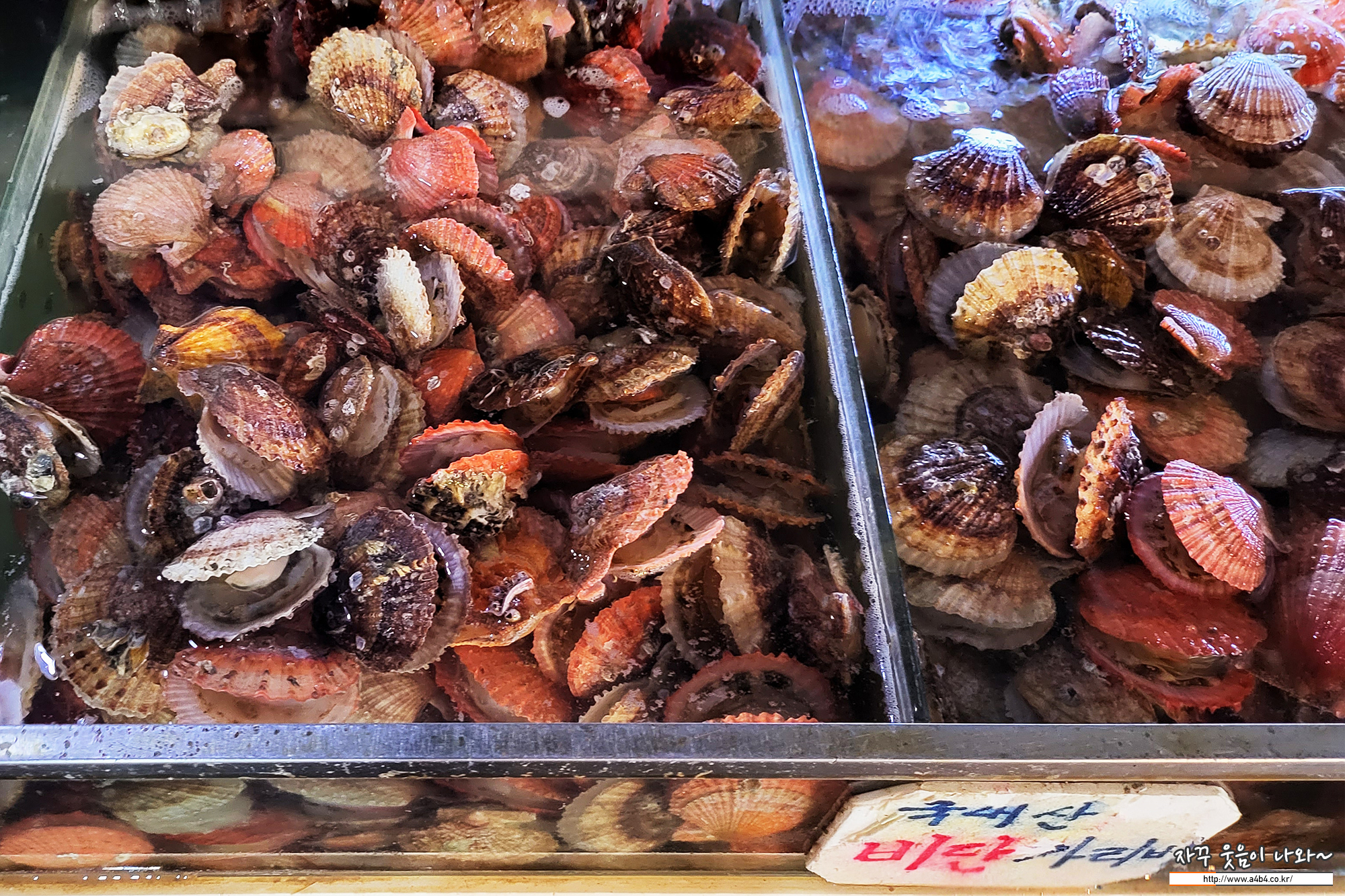관자나, 가리비, 전복은 생으로 소라나 꼬막, 새우 등은 삷은 요리로 나왔네요.