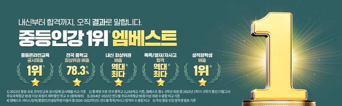 당장 자녀분의 친구중 최상위권 학생에게 물어보세요. 어떤 중등인강을 수강하고 있는지, 무려 2,920명의 전교 1등 학생과 26,902명의 내신 최상위권 학생은 엠베스트를 이용하고 있습니다.