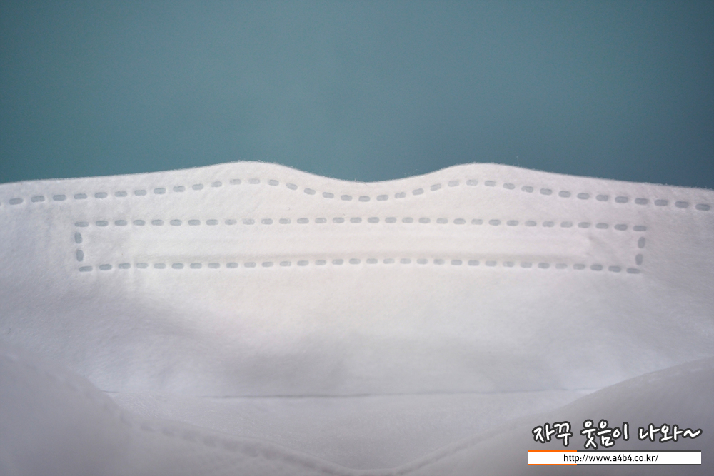 에어줌 황사방역 마스크 내피는 보드러운 감촉의 부직포가 적용 되었습니다. 마스크 내피와 접합 부위에 약간의 보푸라기가 보입니다. 하루종일 마스크를 착용하고 앉아 있으면 볼 부분에 약간의 간지러움이 느껴지네요. 심하지는 않지만 조금 느낌이 옵니다.
