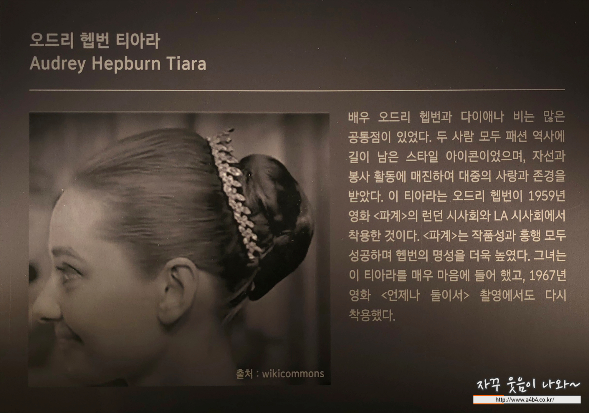 배우 오드리 헵번과 다이애나 비는 많은 공통점이 있었다. 두 사 람 모두 패션 역사에 길이 남은 스타일 아이콘이었으며, 자선과 봉 사 활동에 매진하여 대중의 사랑과 존경을 받았다. 이 티아라는 오 드리 헵번이 1959년 영화 '파계'의 런던 시사회와 LA 시사회에 서 착용한 것이다. '파계'는 작품성과 흥행 모두 성공하며 헵번 의 명성을 더욱 높였다. 그녀는 이 티아라를 매우 마음에 들어 했 고, 1967년 영화 '언제나 둘이서' 촬영에서도 다시 착용했다.