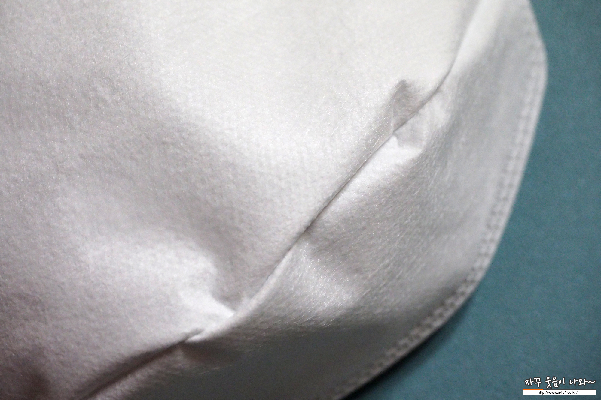 KF94 독도 마스크 대형 안감은 드라이한 촉감의 부직포가 안감으로 사용되었습니다. 마스크에 약품냄새는 없지만 안감에 약간의 보풀이 보입니다. 다만 장시간 착용해도 코나 볼 부분이 가렵거나 간지러운 피부 트러블은 나타나지 않았습니다.