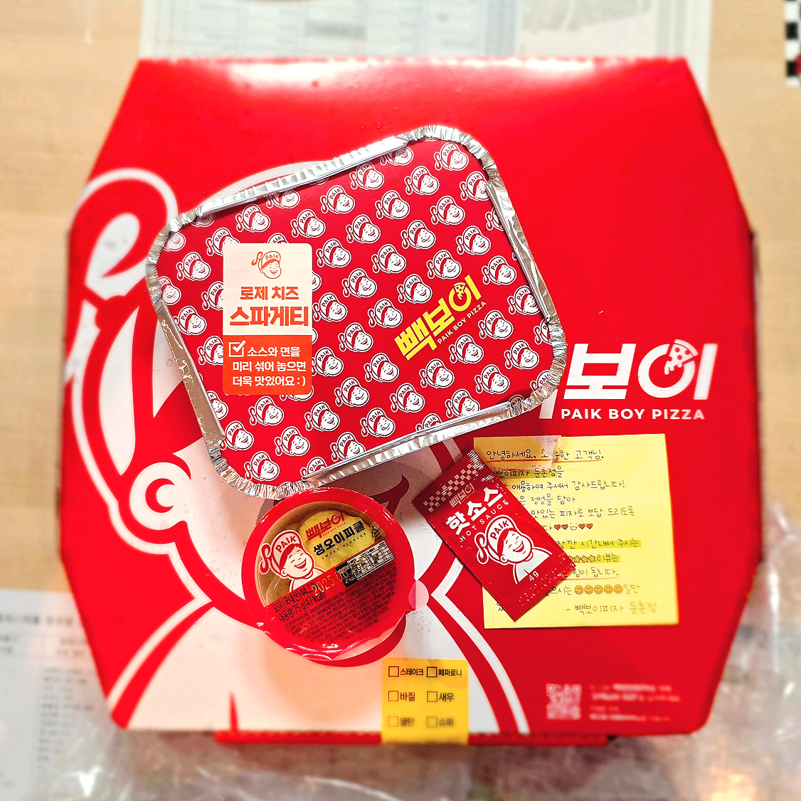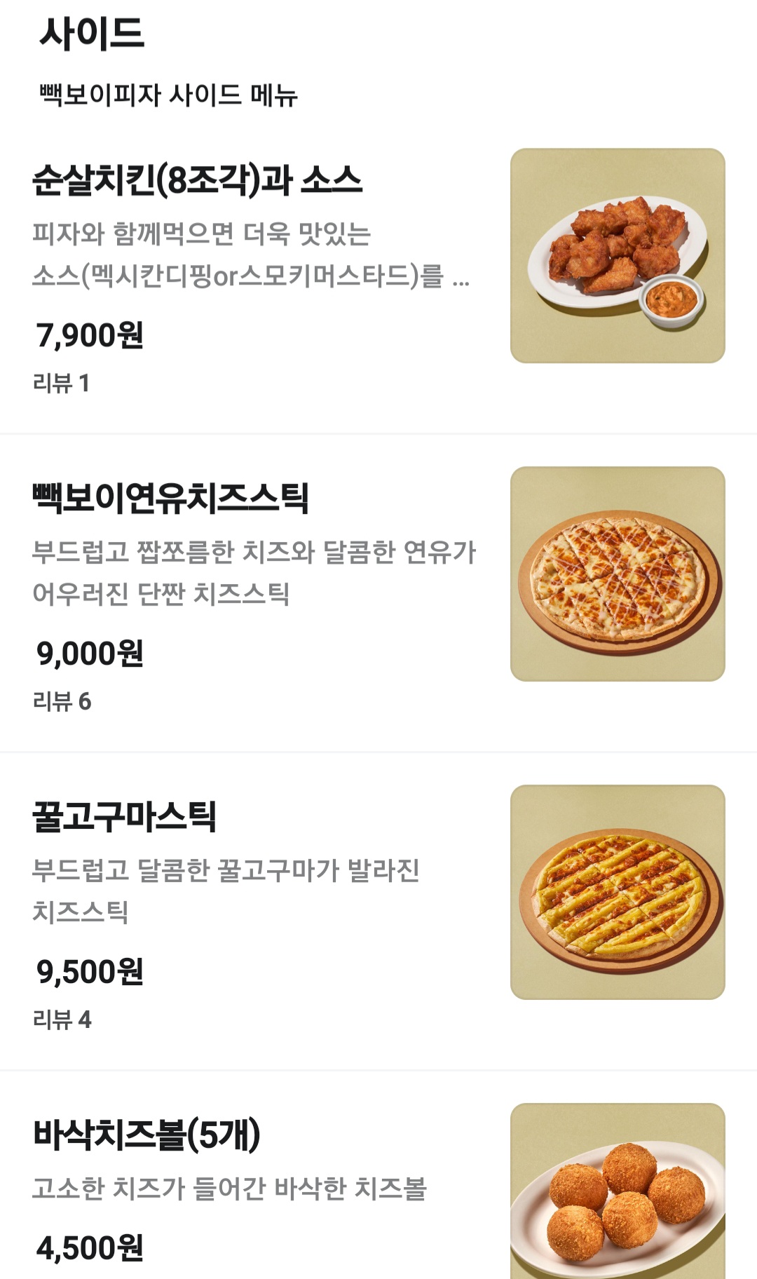 피자이외에도 반반피자와, 스파게티, 순살치킨, 스틱 등 사이드메뉴도 준비되어 있는데요. 새마을식당 연탄불고기, 홍콩반점 짬뽕크림 스파게티 등 다른 백종원 유명 브랜드를 차용한 음식도 빽보이피자 메뉴에 준비되어 있네요.