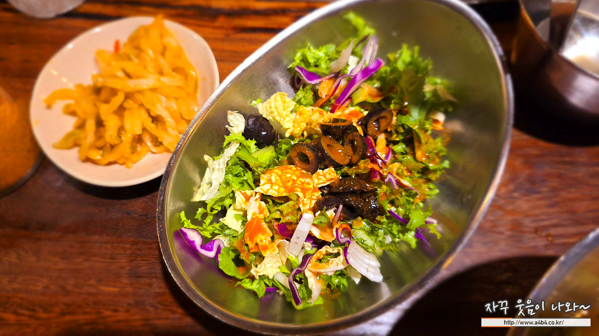 기본 테이블 세팅은 오이냉국과 샐러드 그리고 짜사이가 나옵니다. 오이냉국은 시원하고 좋네요. 다소 기름진 양고기와 잘 어울린다는 생각도