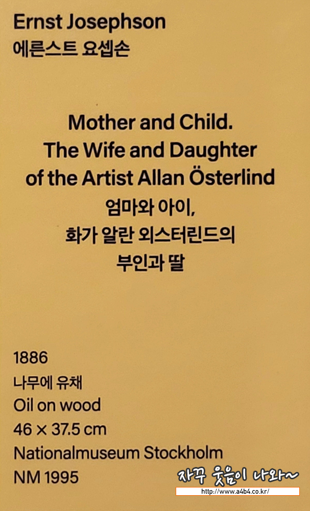 에른스트 요셉손은 초상화와 풍속화를 그린 스웨덴의 화가입니다. 그는 동료 화가이자 친구인 알란 외스터린드의 부인과 딸 의 초상화를 그려주었는데, 전문 모델을 고용할 비용을 아끼기 위해 당대 예술가들 사이에서는 서로를 그려주거나 서로의 가 족을 그려주는 일이 잦았습니다. 이 작품은 외스터린드의 부인인 유제니에게 선사하는 요셉손의 선물이었습니다