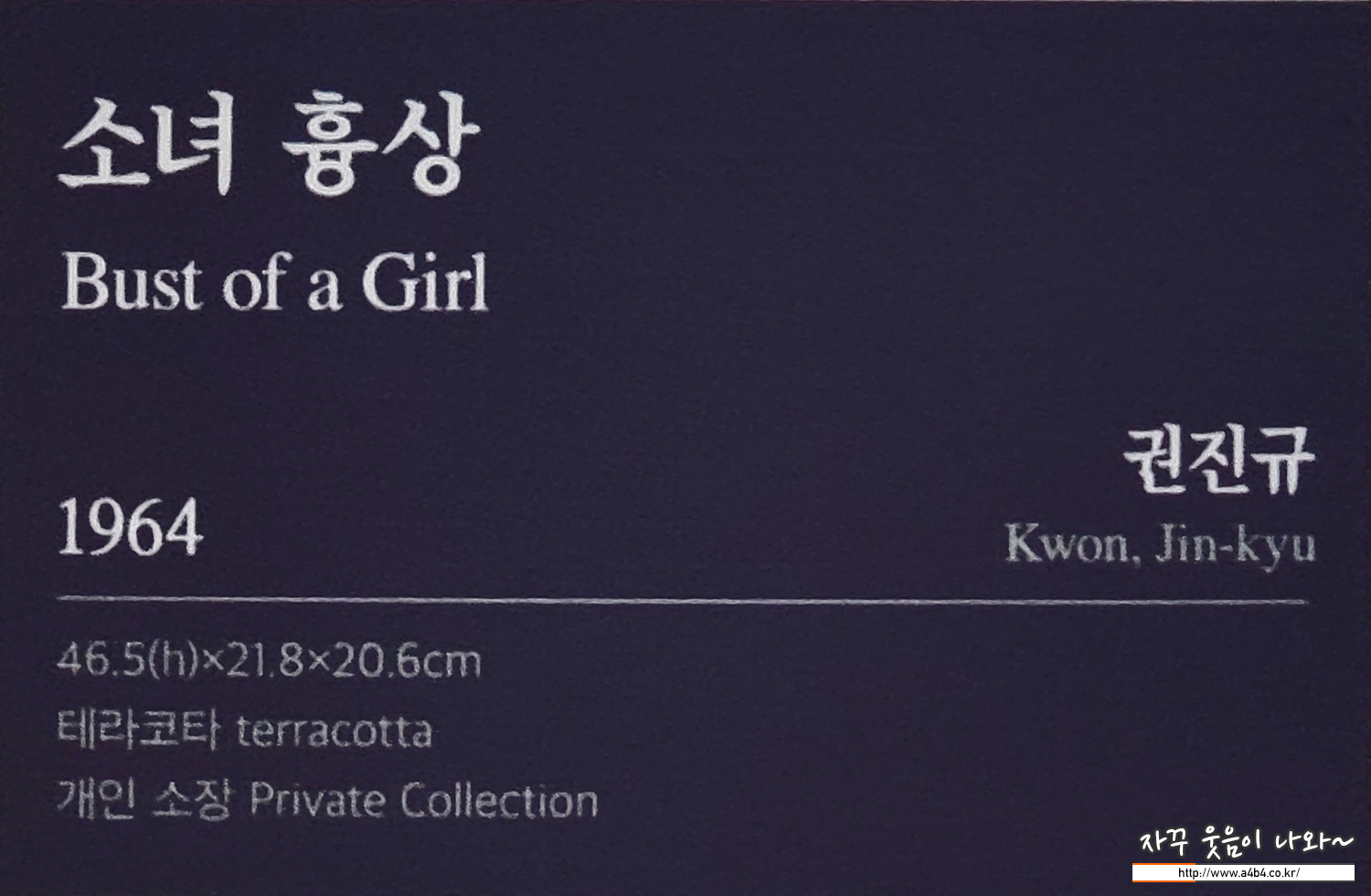 돌, 테라코타, 석고, 건칠 등 다양한 재료와 기법으로 한국적 리얼리즘을 탐구한 조각가 권진규의 소녀상입니다. 다양한 인물상을 만들었던 권진규는 1960년대부터 여성 인물상을 제작하기 시작했습니다. 이 작품은 그의 집 가사를 돕던 '영희'를 모델로 한 작품입니다. 이 작품 외에도 그녀를 모델로 한 작품은 한 점더있습니다. 권진규의 인물상은 공통적으로 얼굴과 시선은 정면을 바라보고 있으나 얼굴을 제외한 부분의 묘사는 과감히 생략되어 있지만, 영희를 모델로 한 두 작품에선 팔과 손이 표현돼 있습니다.