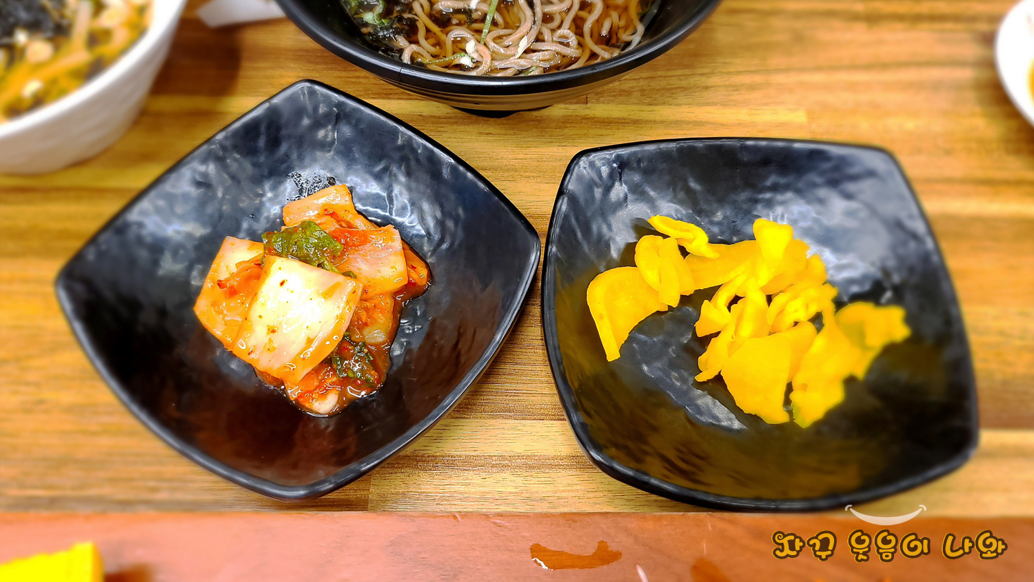잠실새내 맛집 차가네 백반 반찬입니다. 잡채와 동그랄땡, 깍뚜기, 오이김치, 깻잎이 나오네요.
