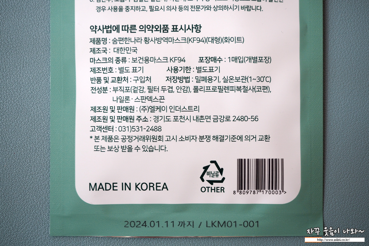 식약처 의약품안전나라 등록명칭은 '숨편한나라 황사방역마스크 Kf94'입니다. 올해 인 21년 3월 승인된 제품으로 마스크 제조원은 '주식회사엘케이인더스트리'로 등록되어 있습니다.
