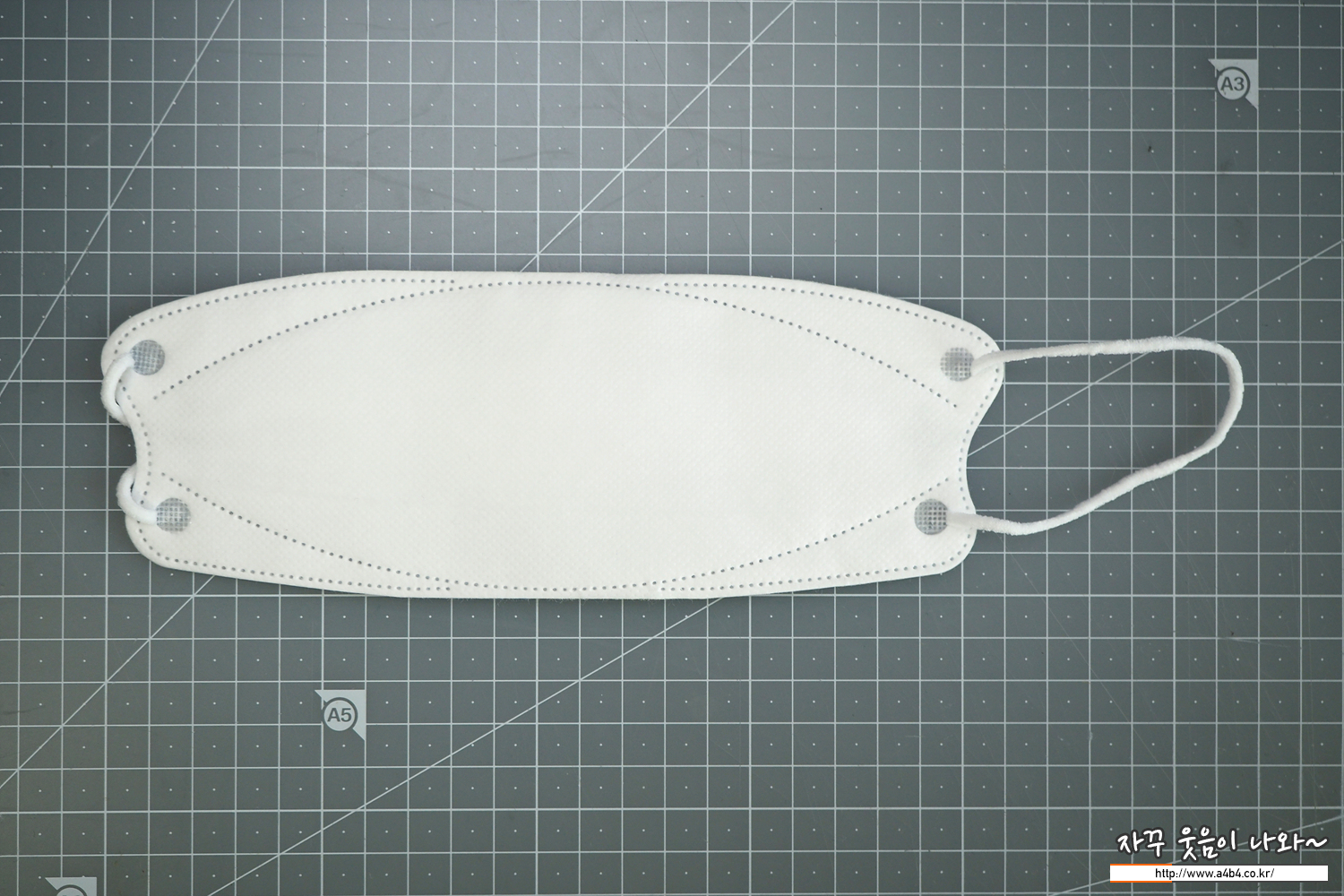 원형의 끈이 마스크 전면에 접착되어 있으며, 접착 상태는 양호합니다. 또한, 귀걸이끈 탄력은 보통 수준을 보여줍니다.