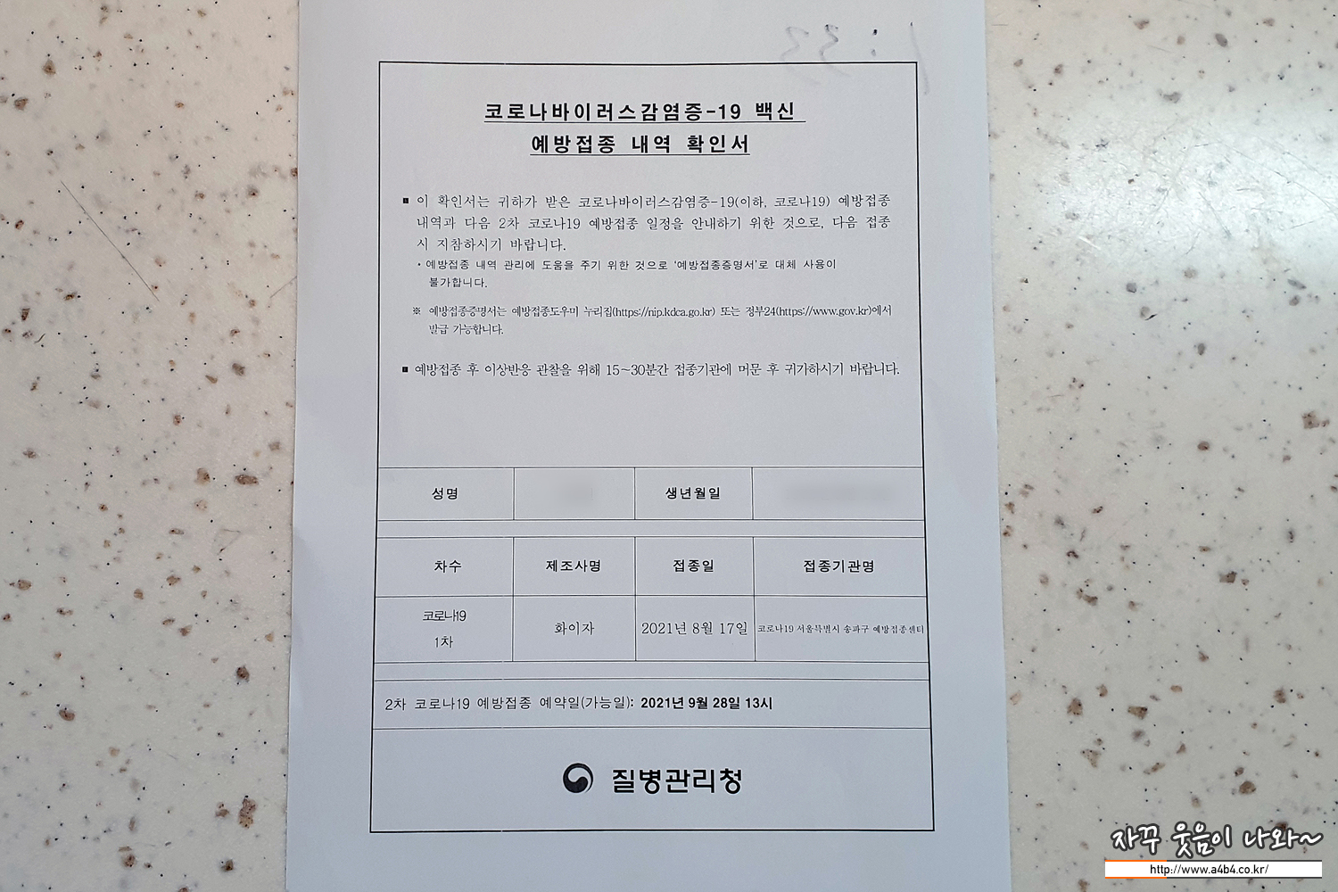 그리고 전산등록을 하면 예방접종 확인서와 코로나 백신 접중 후 부작용과 대처사항에 대한 안내 리플릿을 받습니다.