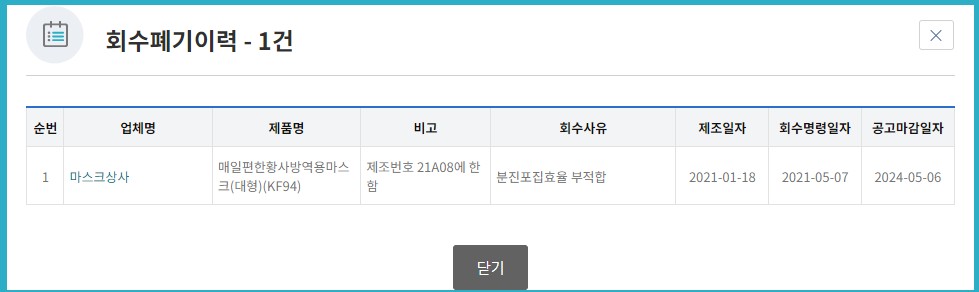 그리고 역시나 올해 불량마스크로 등록된 이력입니다.